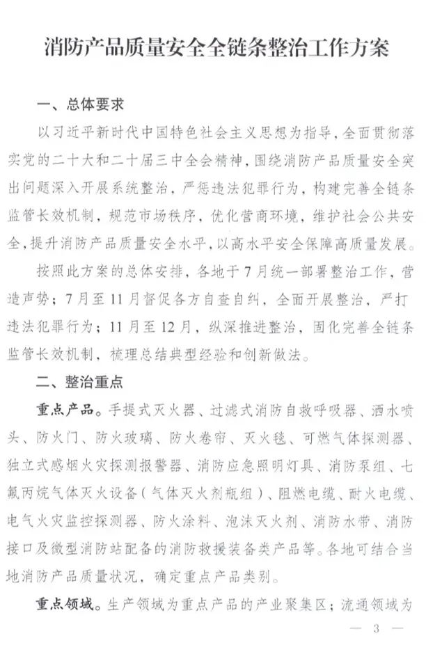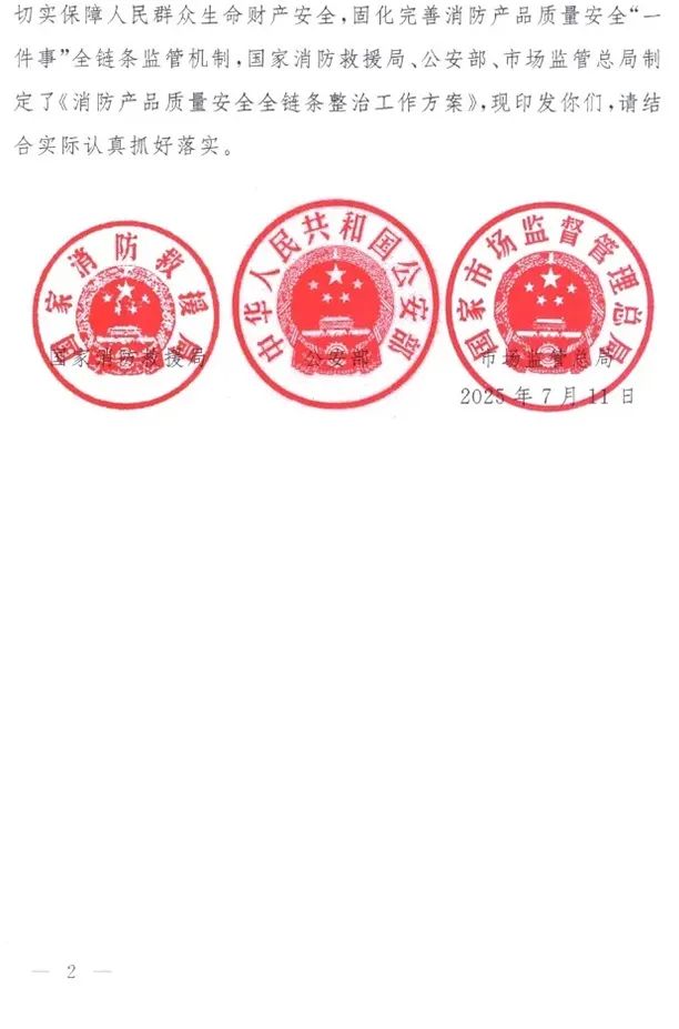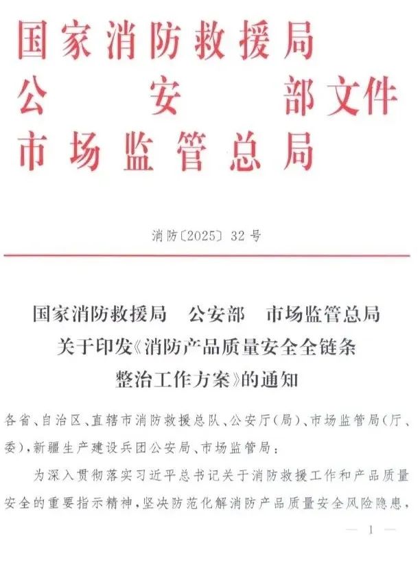 2025年7月11日,國家消防救援局、公安部、市場監管總局聯合發布了《消防產品質量安全全鏈條整治工作方案》。