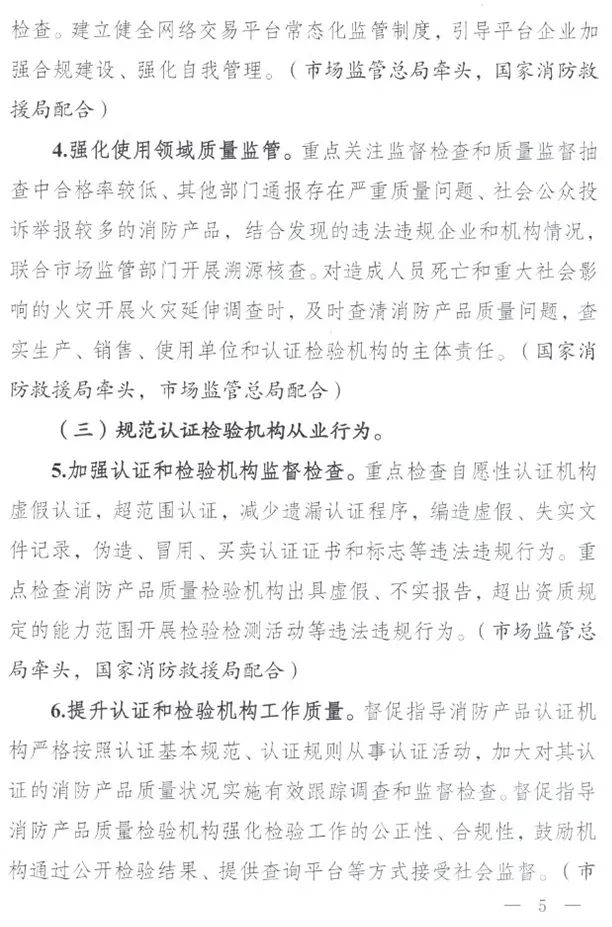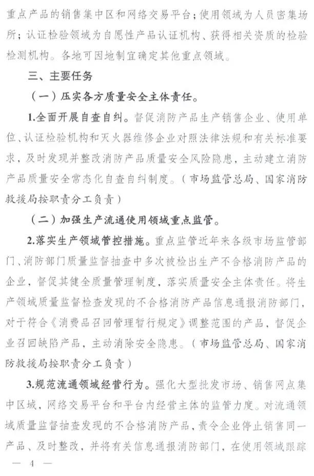 重點領域:生產領域為重點產品的產業聚集區;流通領域為重點產品的銷售集中區和網絡交易平臺;使用領域為人員密集場所;認證檢驗領域為自愿性產品認證機構、獲得相關資質的檢驗檢測機構。各地可因地制宜確定其他重點領域。